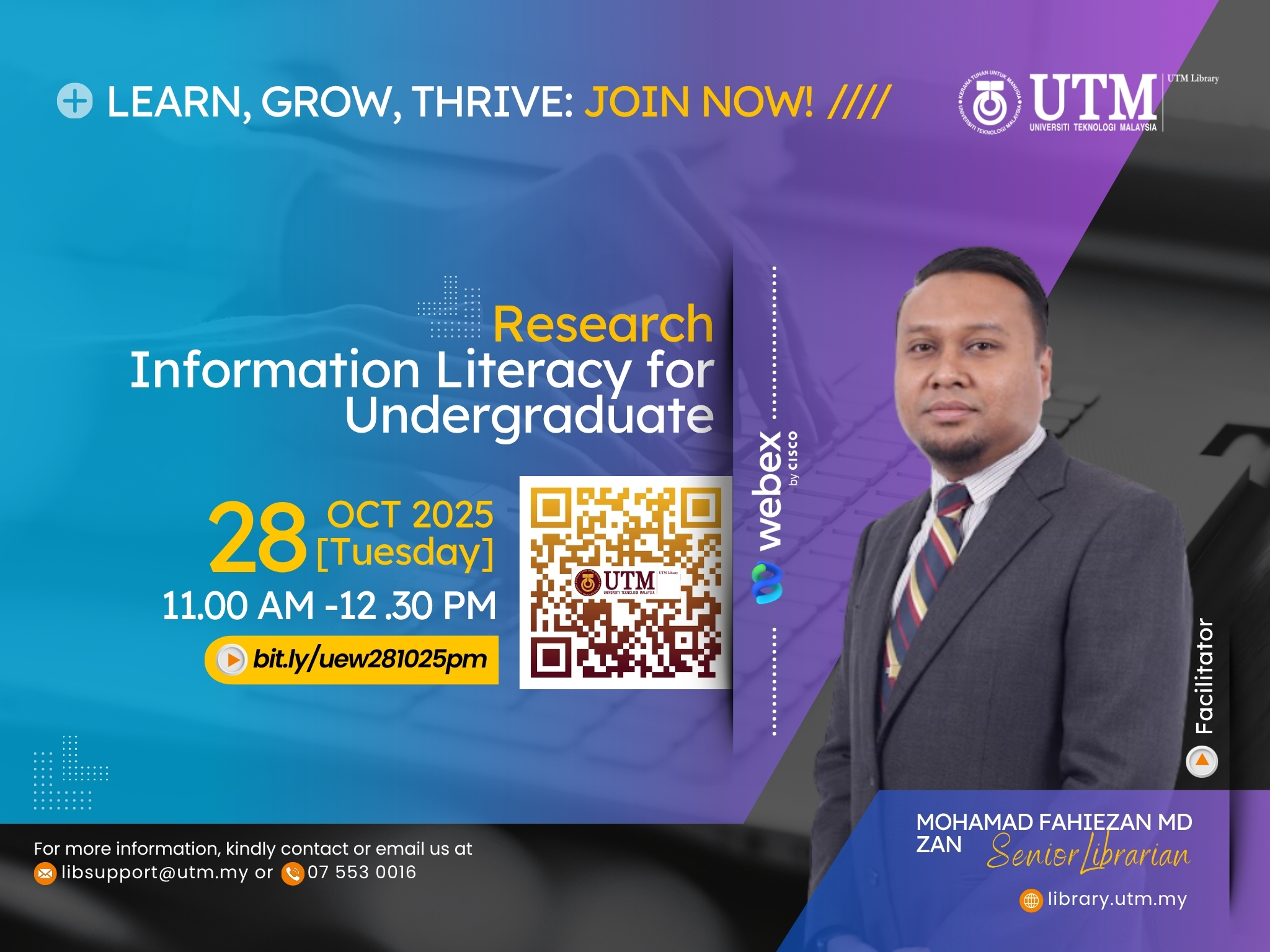 For more details, please visit the UTM Library website or contact the User Education Program coordinator at [PSZJB – Haliza Zainal, haliza@utm.my; PSZKL – Noor Ayesha Mohd Ezanee, ayesha.kl@utm.my].