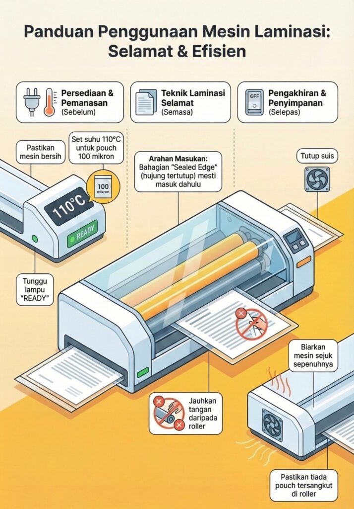 Di kebanyakan tempat kerja, mesin laminasi, mesin pemotong kertas dan mesin pencincang kertas merupakan peralatan yang sering digunakan bagi membantu urusan pengendalian dokumen. Walaupun peralatan ini kelihatan mudah digunakan, ia tetap mempunyai risiko tertentu sekiranya tidak dikendalikan dengan cara yang betul. Oleh itu, setiap pengguna perlu memahami tatacara penggunaan yang selamat bagi mengelakkan kemalangan serta memastikan peralatan sentiasa berada dalam keadaan baik.