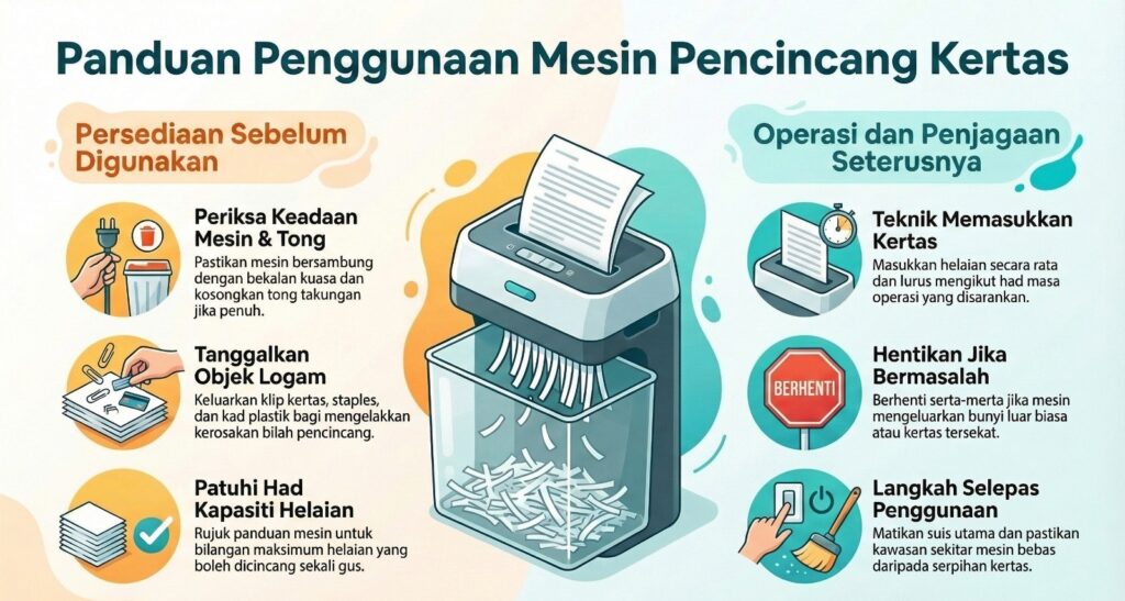 Bagi mesin pencincang kertas, ia digunakan untuk melupuskan dokumen yang tidak lagi diperlukan, terutamanya dokumen yang mengandungi maklumat sulit atau sensitif. Pengguna perlu memastikan jumlah kertas yang dimasukkan tidak melebihi had kapasiti mesin. Selain itu, elakkan memasukkan bahan seperti klip logam, plastik tebal atau objek keras yang boleh merosakkan mekanisme mesin. Sekiranya berlaku kertas tersekat, mesin perlu dimatikan terlebih dahulu sebelum sebarang tindakan diambil untuk mengeluarkan kertas tersebut.