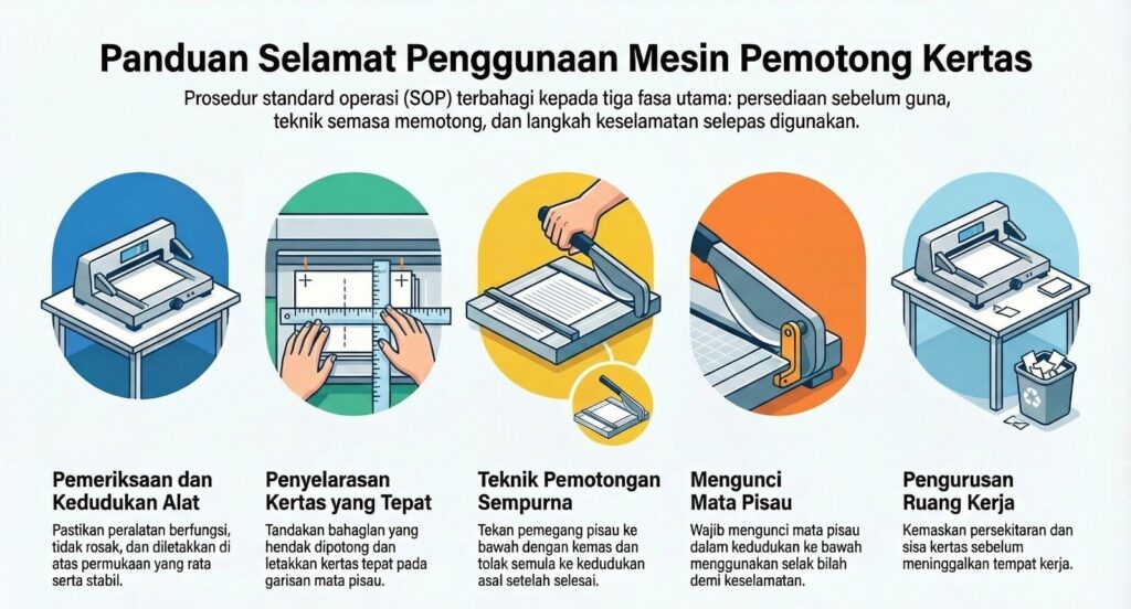 Mesin pemotong kertas pula dilengkapi dengan bilah yang sangat tajam bagi memudahkan pemotongan dokumen dalam jumlah tertentu. Semasa menggunakannya, pengguna perlu memastikan kertas disusun dengan kemas dan tidak melebihi kapasiti pemotongan yang ditetapkan. Tangan hendaklah sentiasa berada jauh daripada kawasan bilah semasa proses pemotongan dilakukan. Penggunaan penghadang keselamatan dan pemegang pemotong hendaklah dilakukan dengan berhati-hati bagi mengelakkan kecederaan.