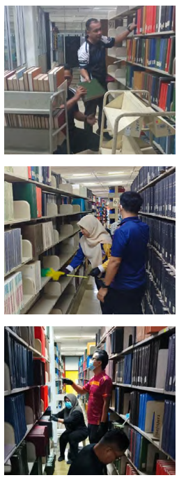 Kerja kekemasan seperti pembersihan habuk dilakukan di tiap-tiap barisan rak yang dikosongkan.