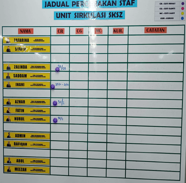 Inspirasi idea baru dengan menambahkan gambar dan jawatan staf pada setiap penama di papan pergerakan. Papan pergerakan dihiasi rekaan baharu pada penama staf USK merupakan hasil rekaan baharu yang dibuat oleh Encik Hasbullah dan dibantu staf lain dalam penghasilan penama staf melalui mencetak, memotong dan laminate penama tersebut.