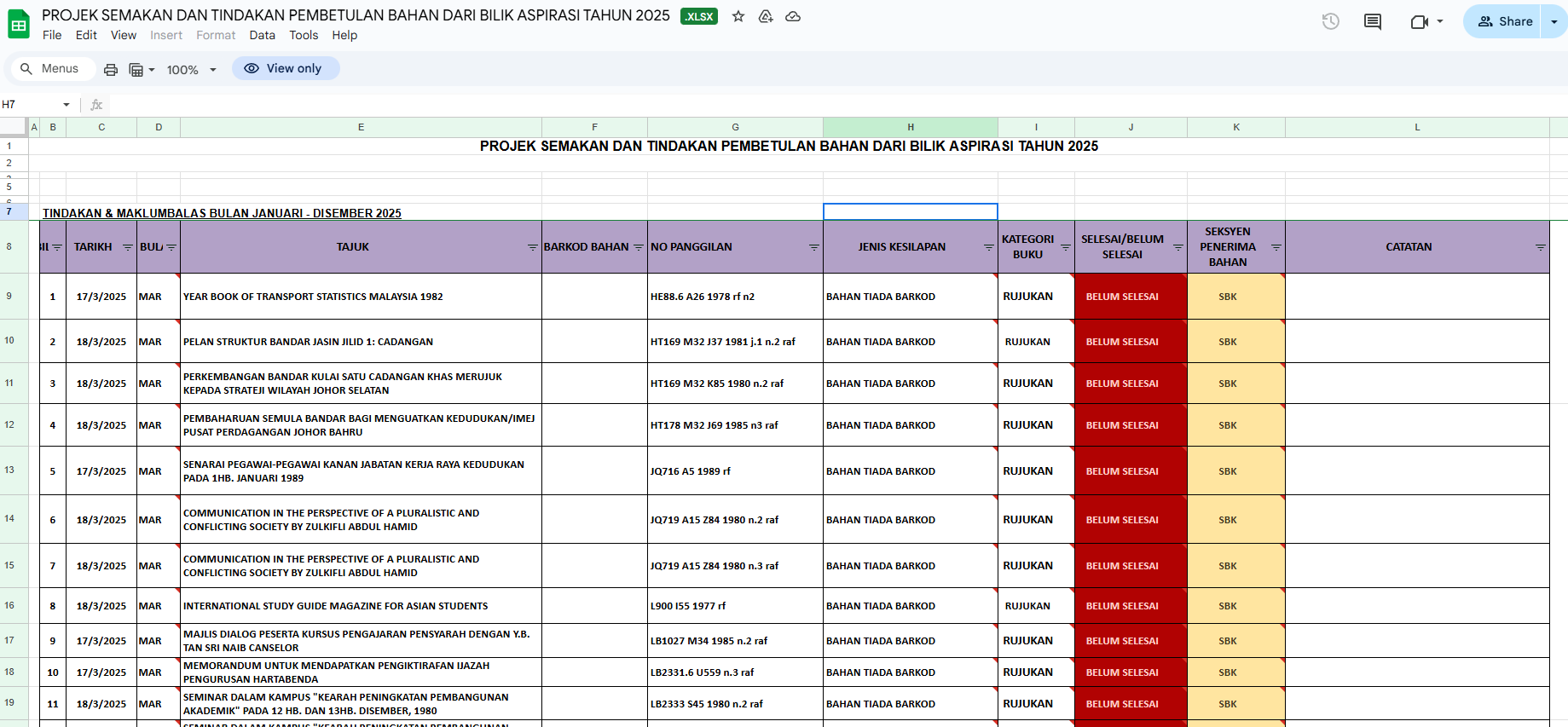 Sebanyak 108 naskhah telah dihantar kepada Unit Katalaog untuk tindakan pembetulan.