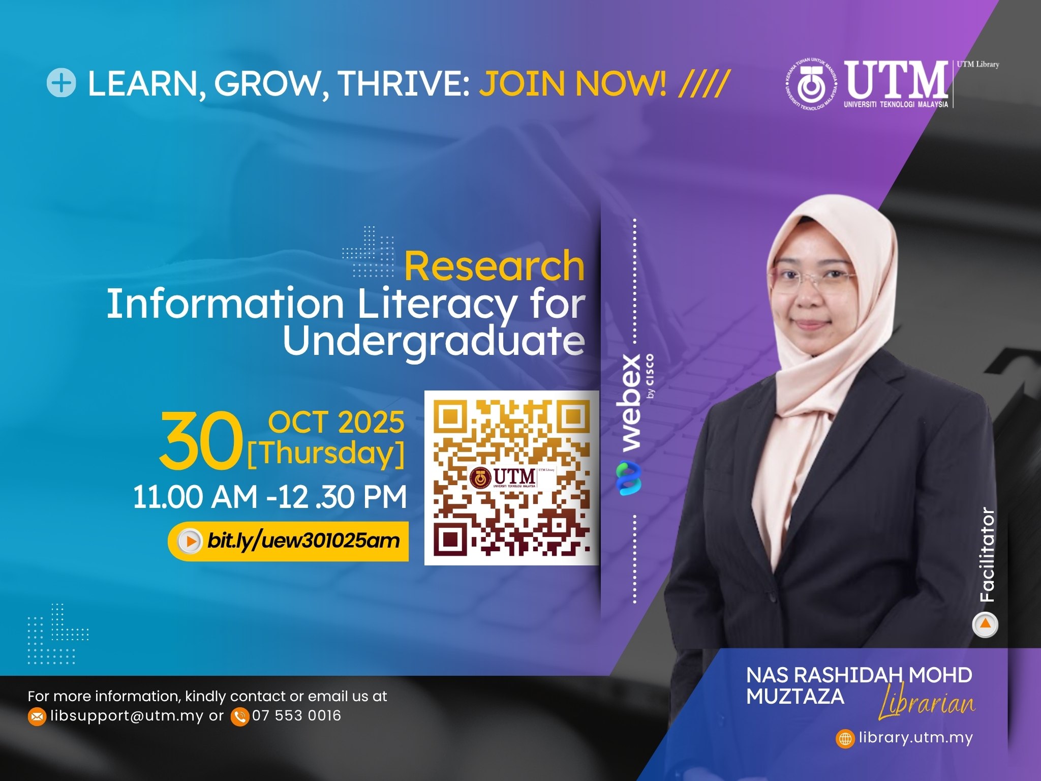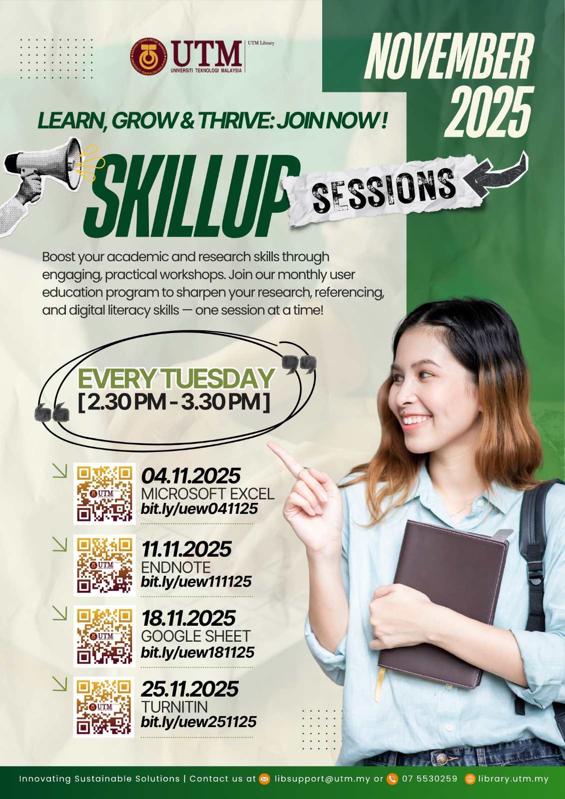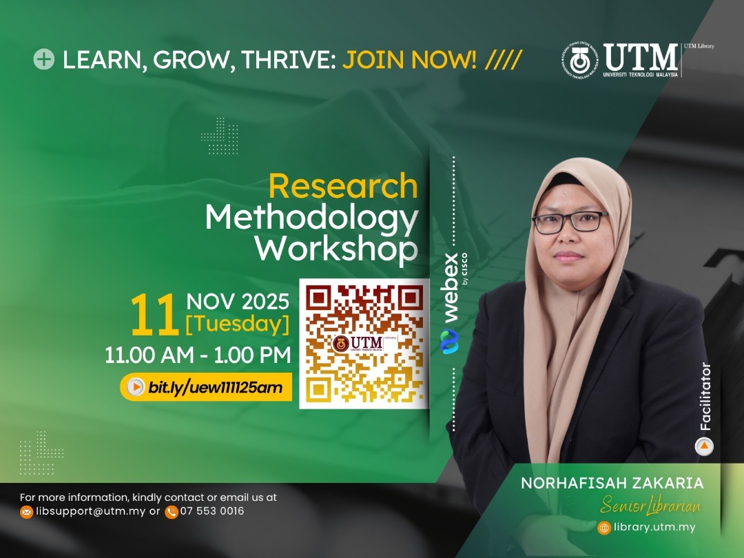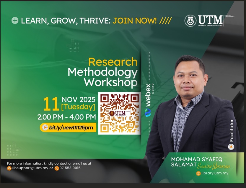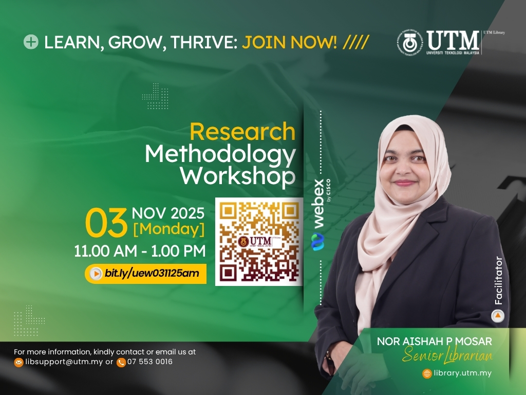 For more details, please visit the UTM Library website or contact the User Education Program coordinator at [PSZJB – Haliza Zainal, haliza@utm.my; PSZKL – Noor Ayesha Mohd Ezanee, ayesha.kl@utm.my].