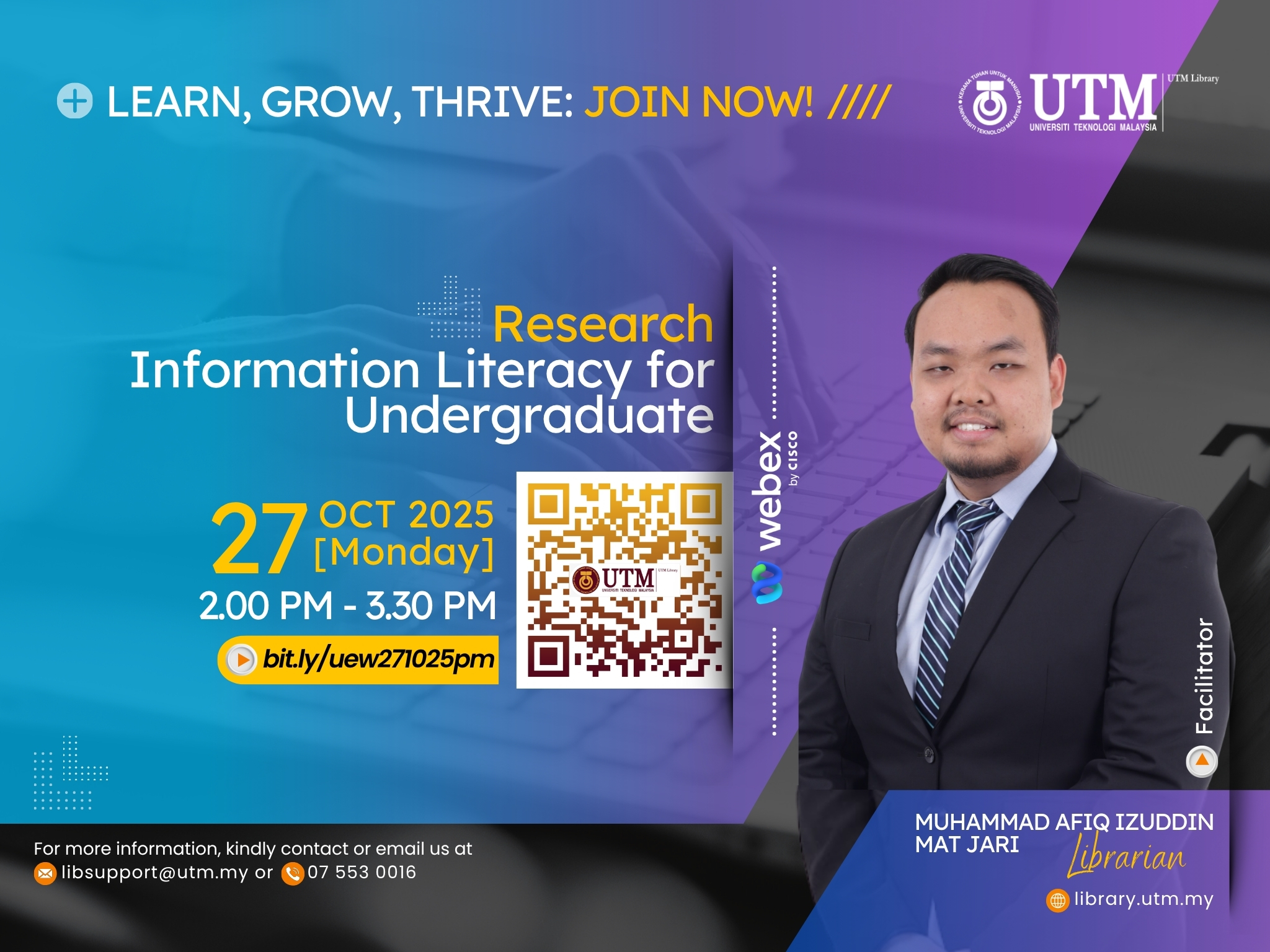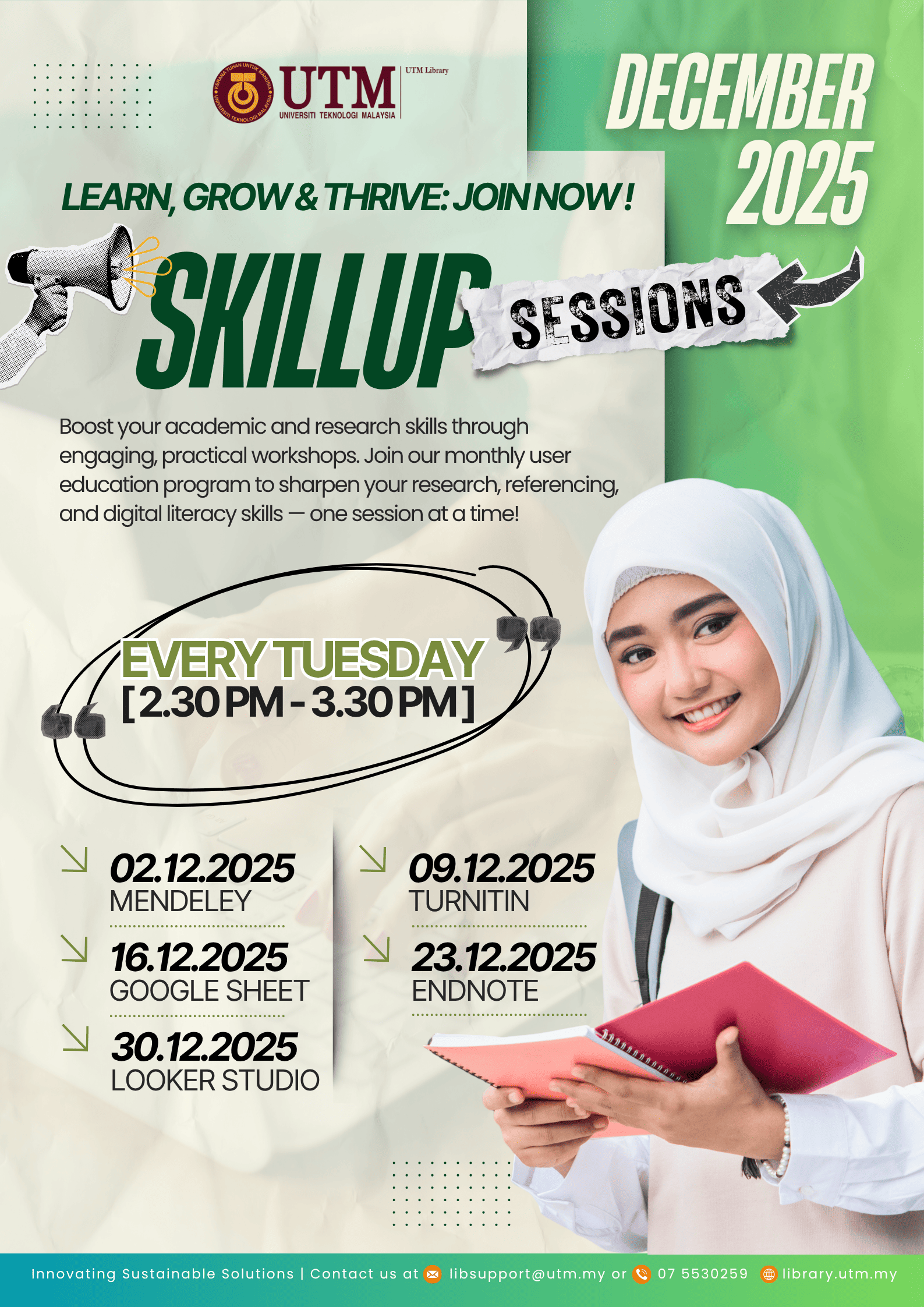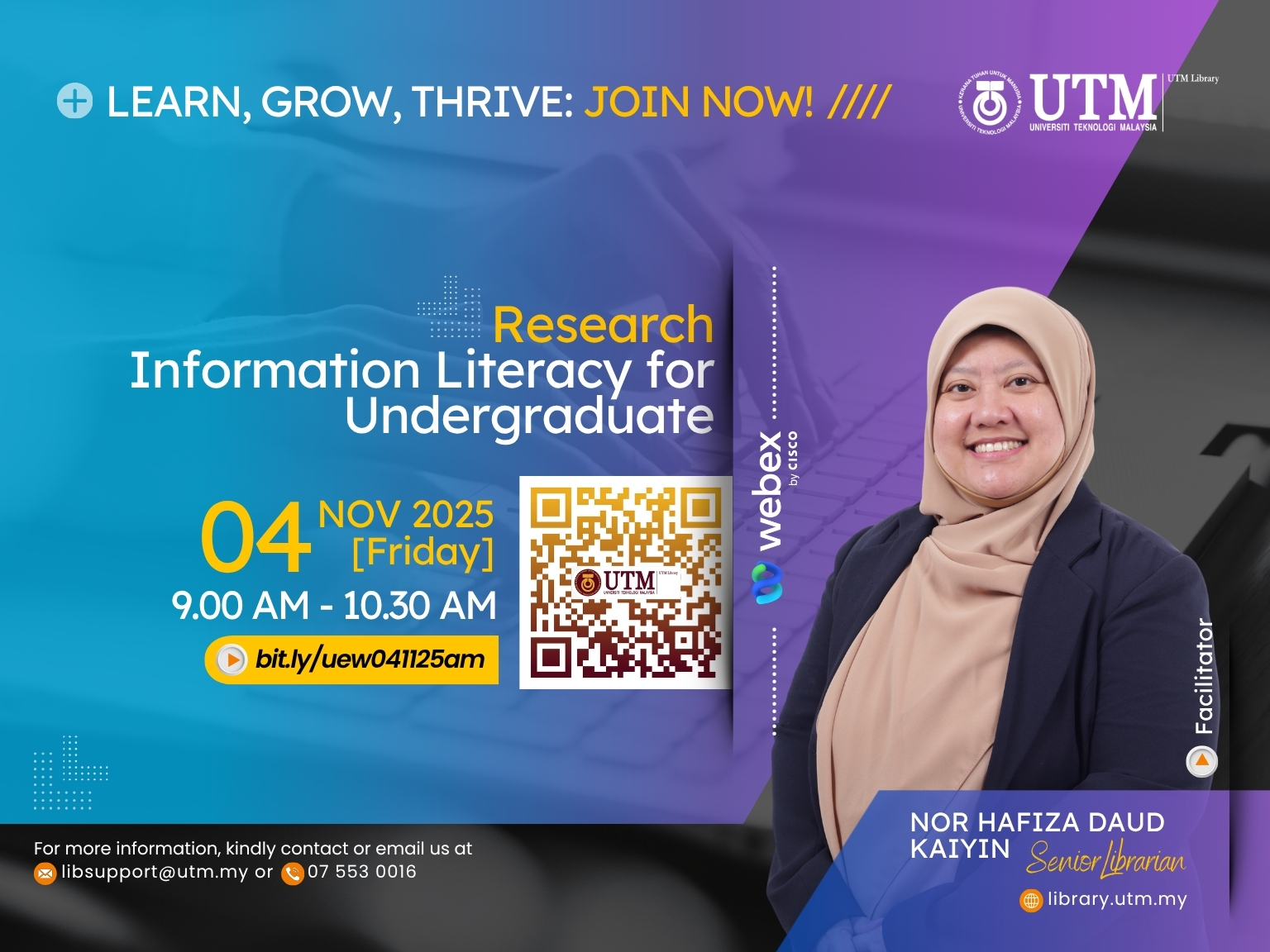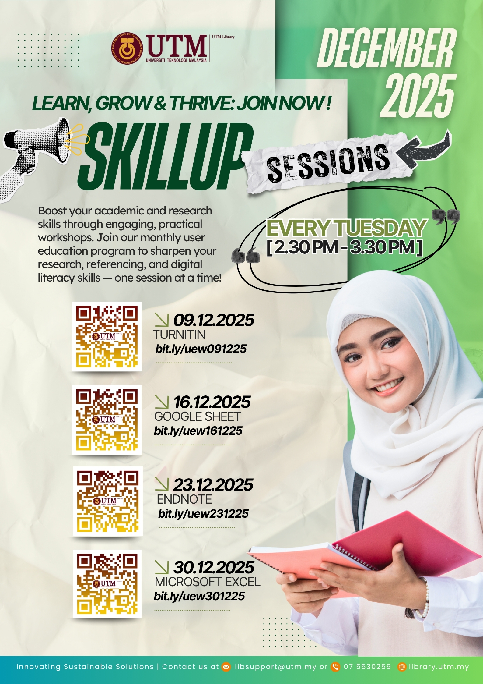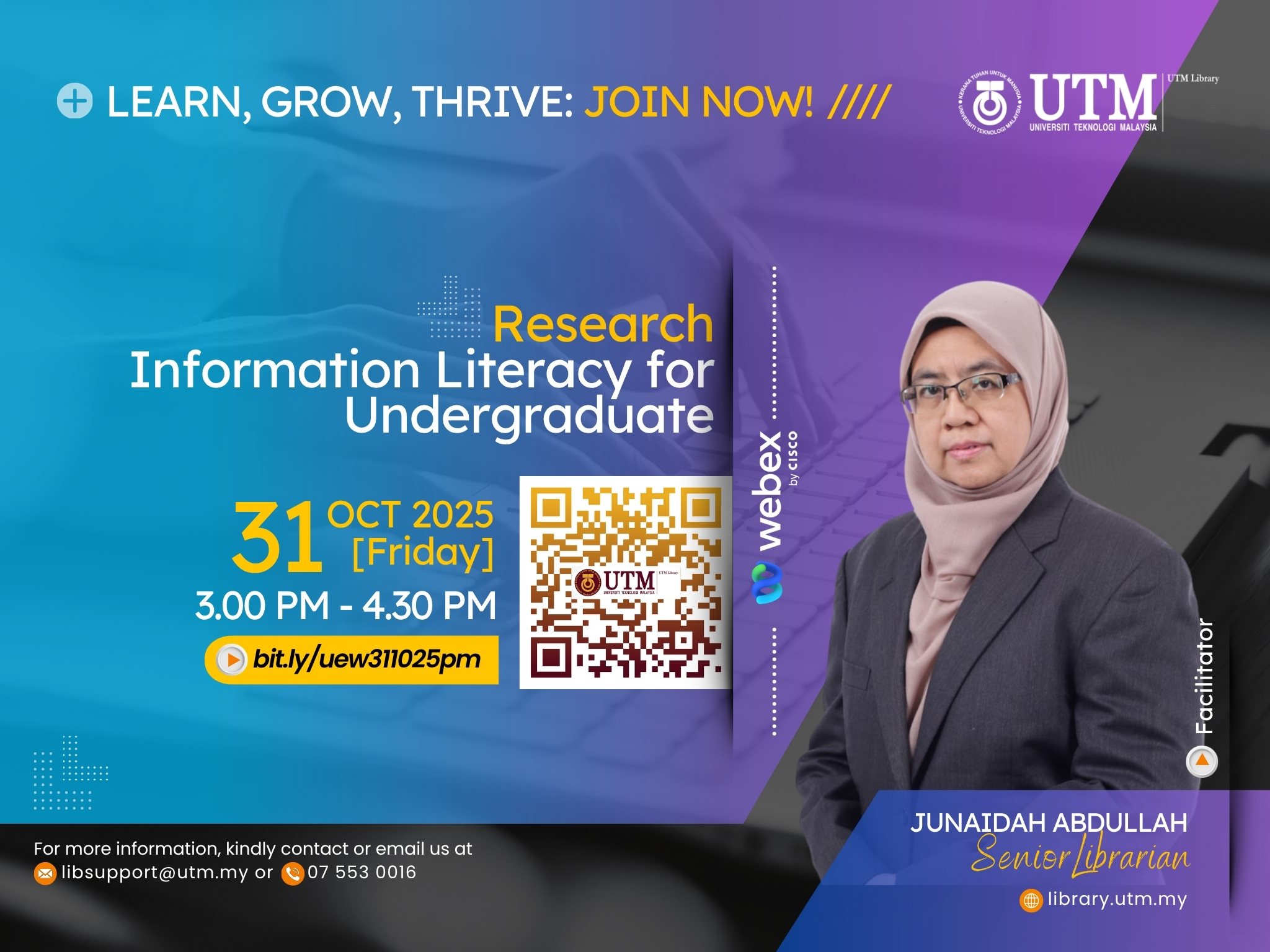 For more details, please visit the UTM Library website or contact the User Education Program coordinator at [PSZJB – Haliza Zainal, haliza@utm.my; PSZKL – Noor Ayesha Mohd Ezanee, ayesha.kl@utm.my].