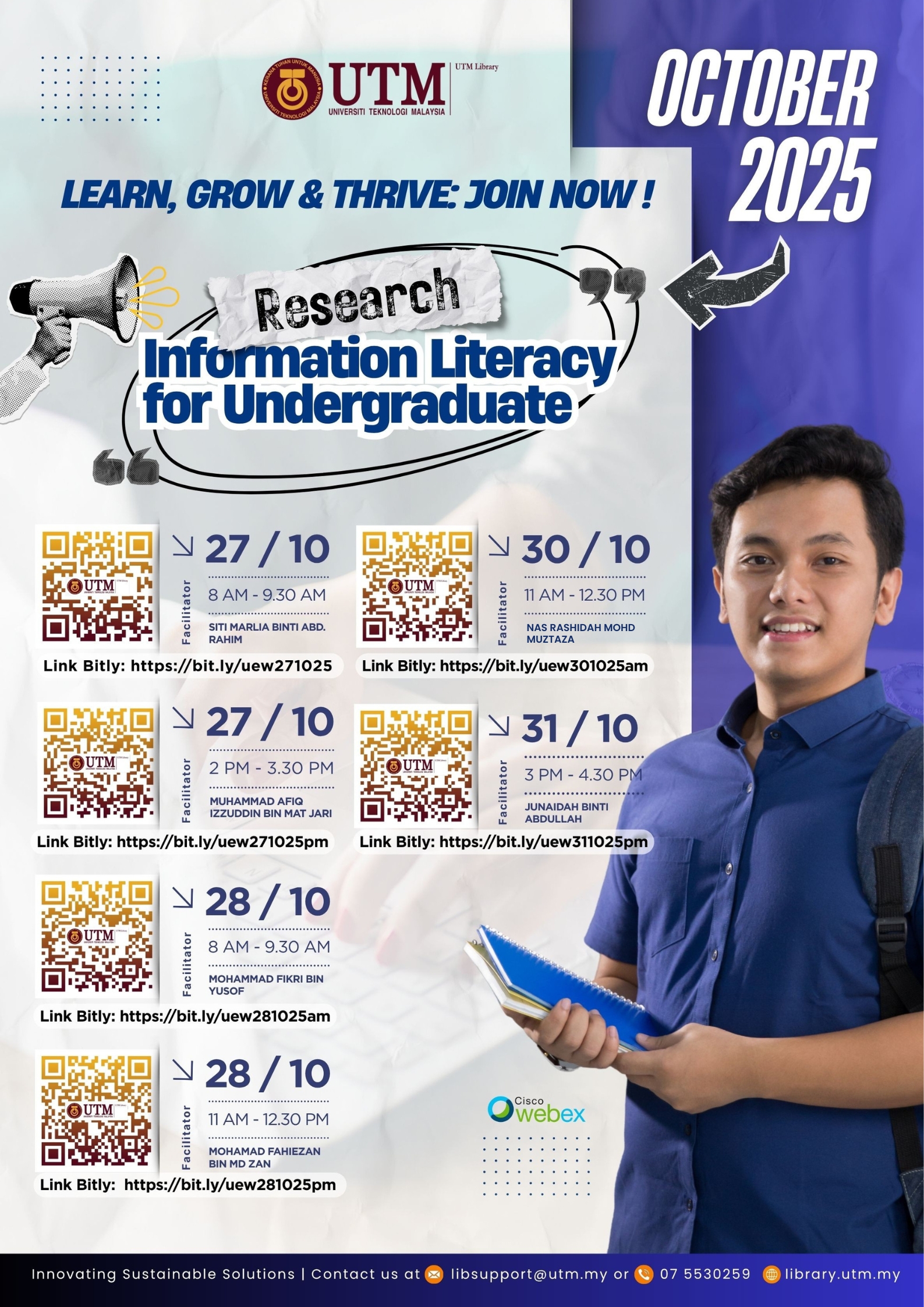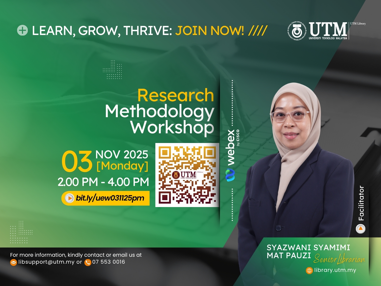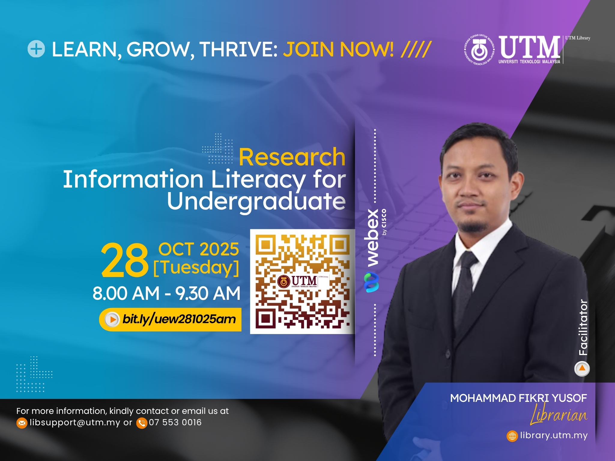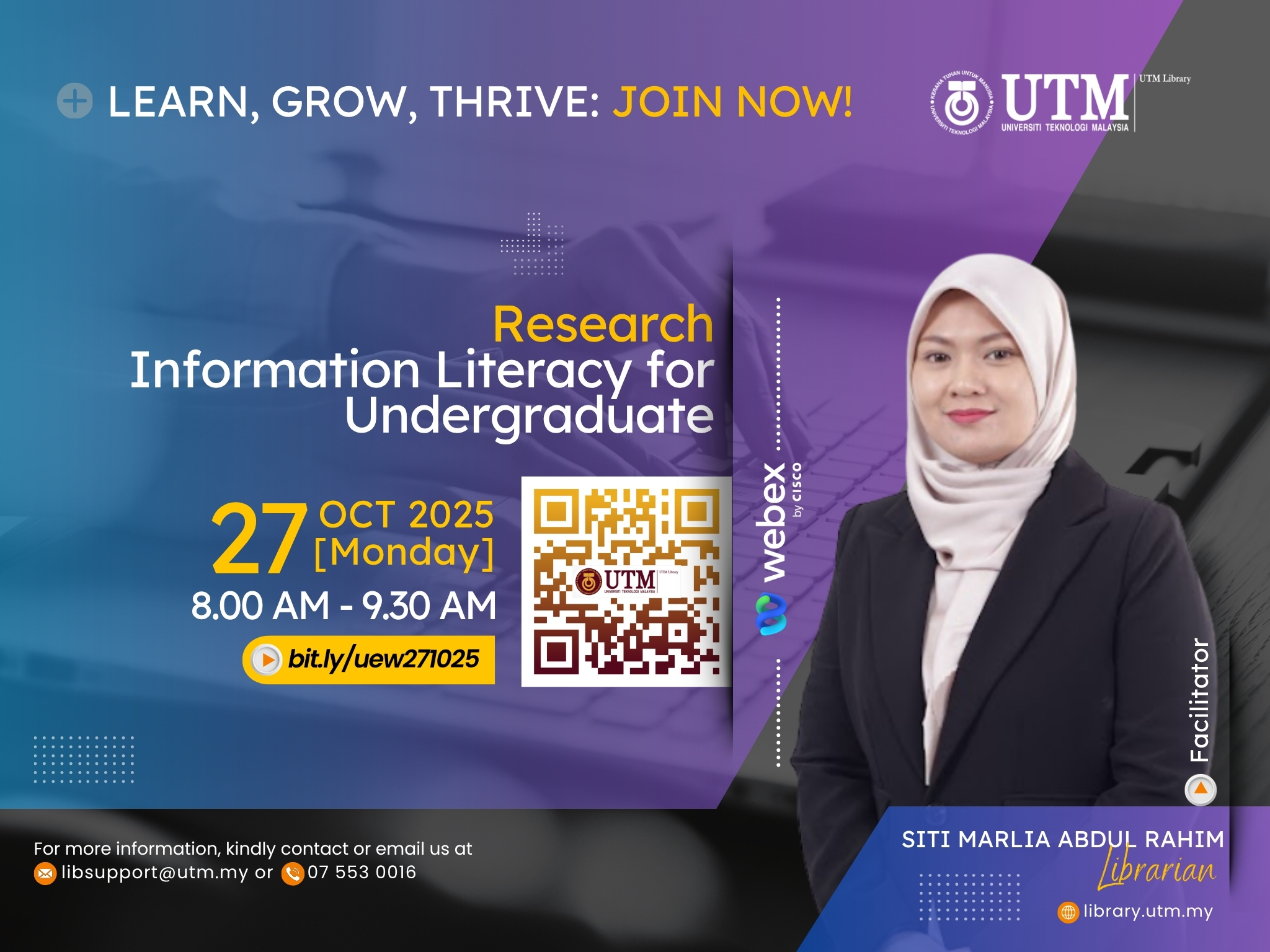 For more details, please visit the UTM Library website or contact the User Education Program coordinator at [PSZJB – Haliza Zainal, haliza@utm.my; PSZKL – Noor Ayesha Mohd Ezanee, ayesha.kl@utm.my].