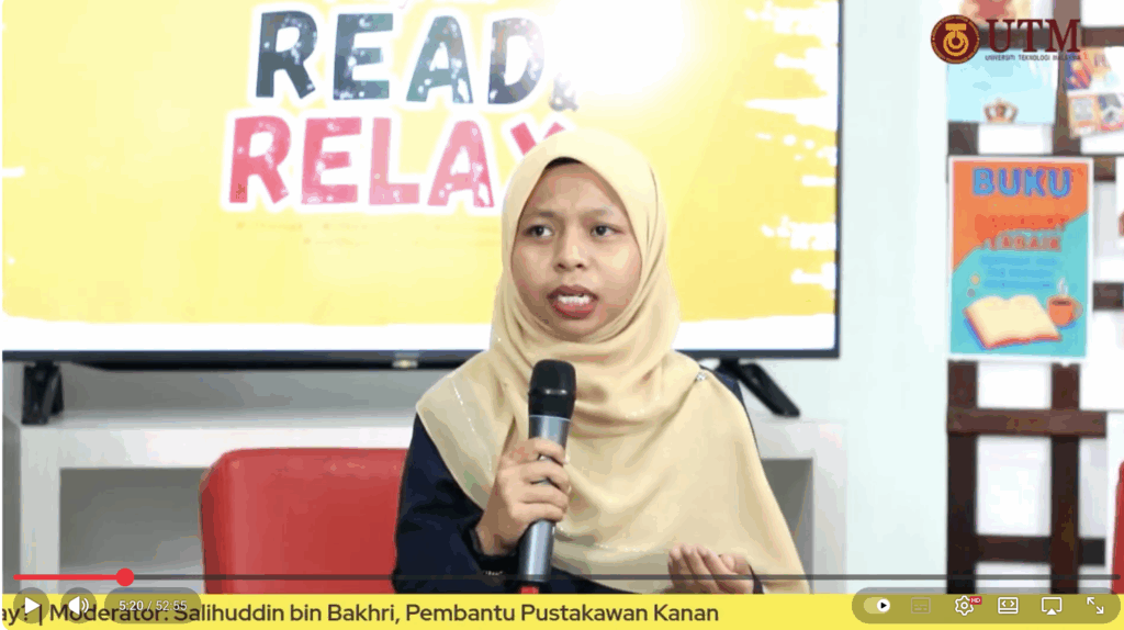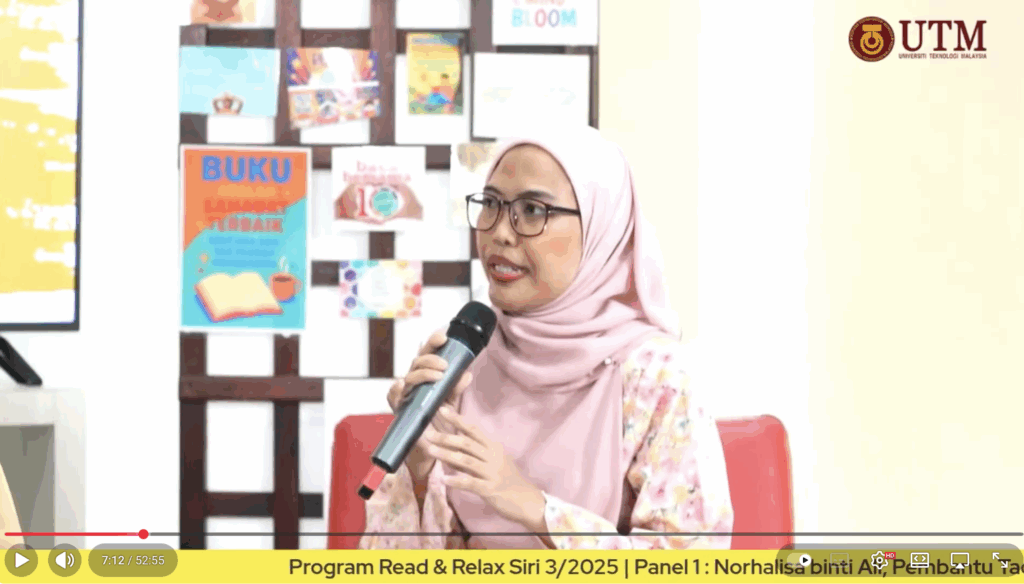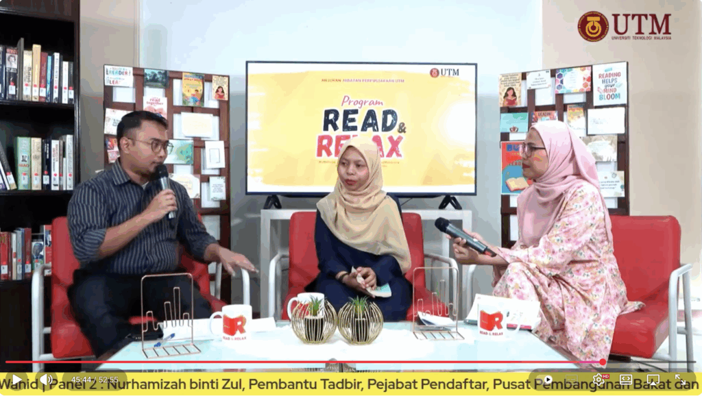 Program Read & Relax Siri 3/2025 anjuran Jabatan Perpustakaan UTM, telah diadakan pada hari Khamis, 7 Ogos 2025. Program ini disiarkan secara langsung melalui Facebook dan YouTube rasmi Jabatan Perpustakaan UTM. Sesi kali ini dikendalikan oleh saudara Salihuddin bin Bakhri dari Jabatan Perpustakaan UTM. Manakala panel jemputan terdiri daripada Puan Norhalisa binti Ali dan Puan Norhamizah binti Zul staf dari Pusat Pembangunan Bakat dan Kepimpinan, UTM.
