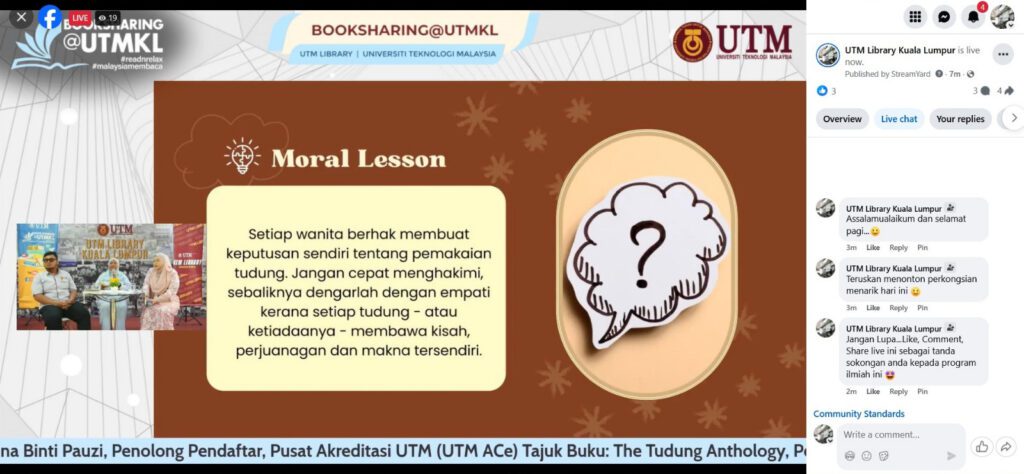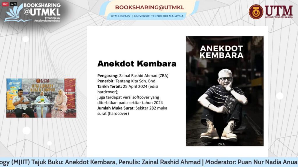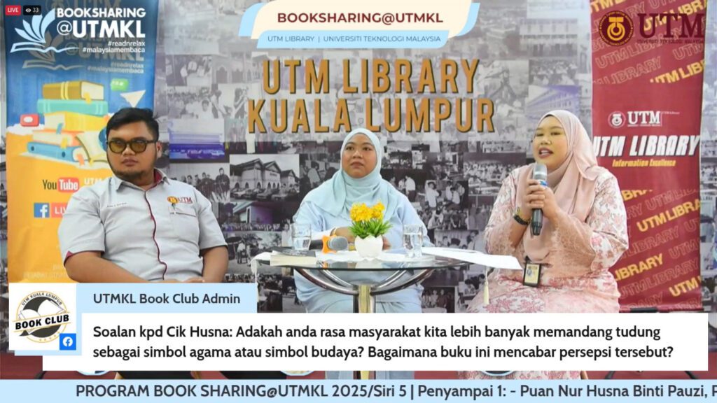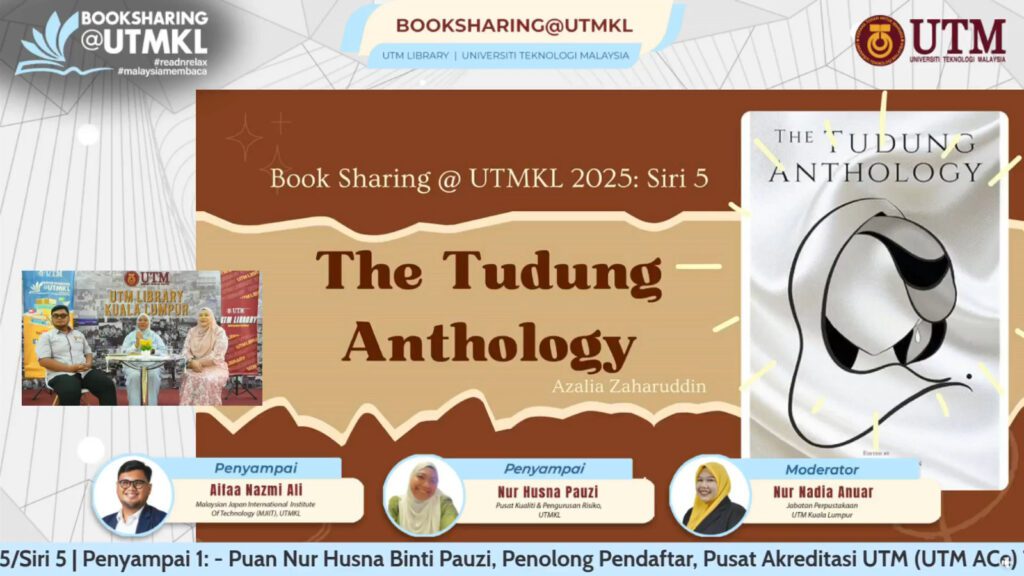 Program BookSharing@UTMKL 2025 Siri ke-5 telah bersiaran secara langsung pada 30 Julai 2025 (Rabu). Sesi kali ini menampilkan dua orang panel pengulas yang berkongsi bahan bacaan pilihan masing-masing iaitu Puan Nur Husna Pauzi dari Pusat Akreditasi UTM (UTM ACe) dan Encik Aifaa Nazmi Ali dari Malaysia Japan International Institute of Technology (MJIIT). Moderator untuk sesi kali ini ialah Puan Nur Nadia Anuar dari Perpustakaan UTMKL.