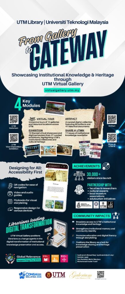 When our poster, “From Gallery to Gateway: Showcasing Institutional Knowledge & Heritage Through UTM Virtual Gallery”, was announced as the First Prize winner in the CONSAL Boulevard Poster Competition, it was both a pleasant surprise and a humbling moment. It was never about competing or winning. It was about telling a story that shows how libraries can evolve, connect people with knowledge and keep institutional memory relevant in a changing world.