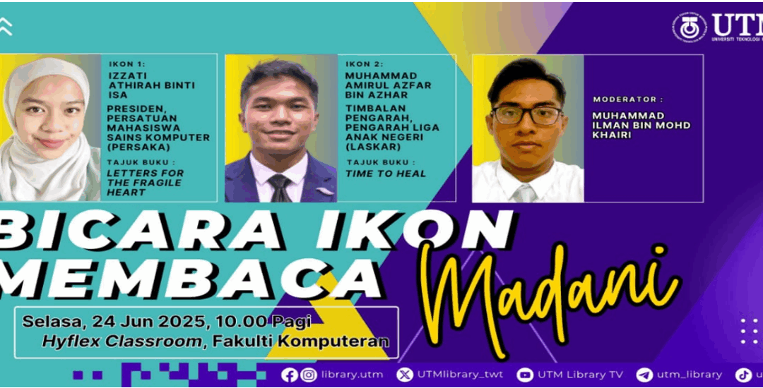 Program Bicara Ikon Membaca Madani 2025 memulakan sirinya yang pertama pada 24 Jun 2025 dan berlangsung di Bilik Hyflex Classroom, Fakulti Komputeran UTMJB bersempena dengan Jelajah Kempen Membaca Madani anjuran Jabatan Perpustakaan UTM (JPUTM) dan sinergi bersama Fakulti Komputeran, UTMJB. Siri ini juga turut disiarkan secara langsung melalui platform Facebook dan Youtube Perpustakaan UTM bermula pada jam 10 pagi.