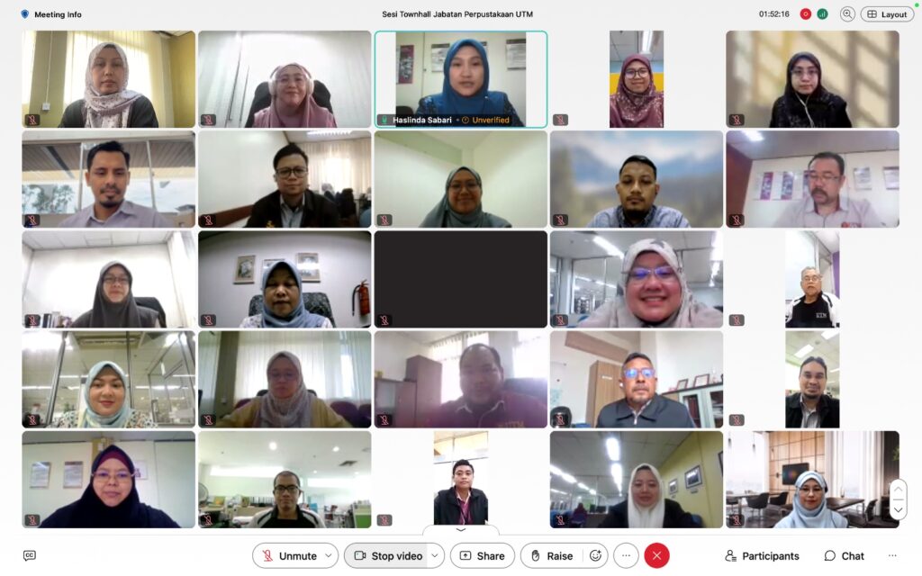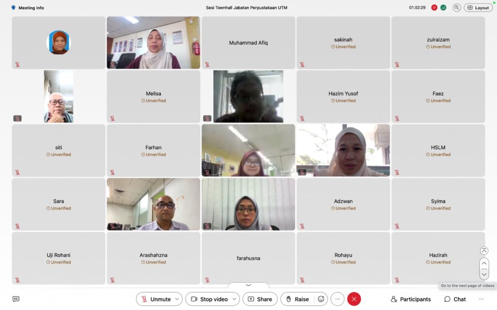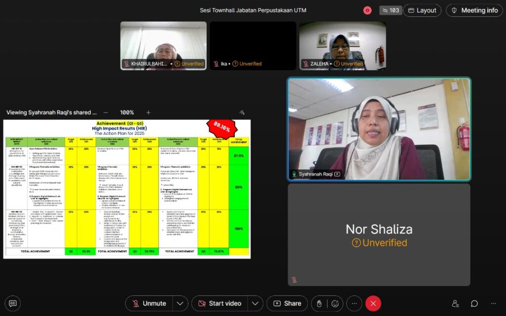 Jabatan Perpustakaan Universiti Teknologi Malaysia (JPUTM) telah mengadakan Sesi Townhall Pelaporan Pencapaian Pelan Tindakan enVision Q3 2025 secara dalam talian melalui aplikasi CISCO Webex pada 10 November 2025. Ucapan aluan telah disampaikan oleh pengacara majlis, Puan Haslinda binti Sabari selaku Ketua Seksyen Korporat dan Strategik, JPUTM dan disusuli dengan bacaan doa oleh Encik Muhammad ’Atiff bin Mahussain. Sesi dimulakan dengan pembentangan oleh Puan Zaleha binti Atan, Timbalan Ketua Pustakawan (Perkhidmatan), merangkap ketua penggerak enVision JPUTM 2025 yang bertujuan menyampaikan perkembangan kemajuan pelaksanaan pelan tindakan perpustakaan bagi suku ketiga tahun 2025 selaras dengan strategi universiti melalui enVision UTM 2025.
