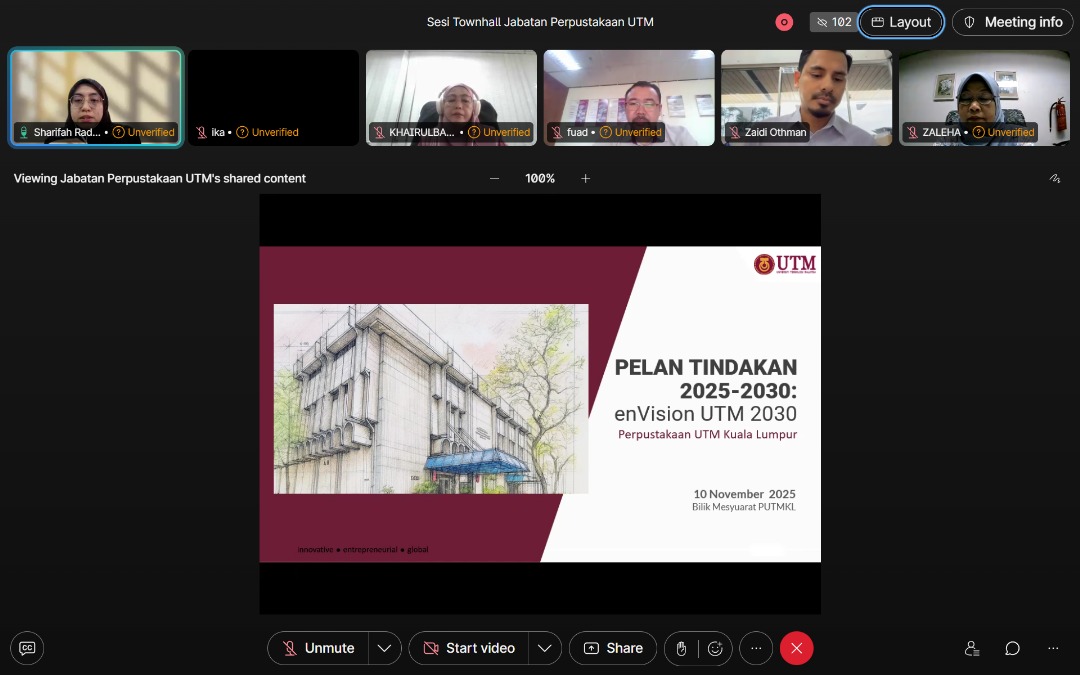 Jabatan Perpustakaan Universiti Teknologi Malaysia (JPUTM) telah mengadakan Sesi Townhall Pelaporan Pencapaian Pelan Tindakan enVision Q3 2025 secara dalam talian melalui aplikasi CISCO Webex pada 10 November 2025. Ucapan aluan telah disampaikan oleh pengacara majlis, Puan Haslinda binti Sabari selaku Ketua Seksyen Korporat dan Strategik, JPUTM dan disusuli dengan bacaan doa oleh Encik Muhammad ’Atiff bin Mahussain. Sesi dimulakan dengan pembentangan oleh Puan Zaleha binti Atan, Timbalan Ketua Pustakawan (Perkhidmatan), merangkap ketua penggerak enVision JPUTM 2025 yang bertujuan menyampaikan perkembangan kemajuan pelaksanaan pelan tindakan perpustakaan bagi suku ketiga tahun 2025 selaras dengan strategi universiti melalui enVision UTM 2025.