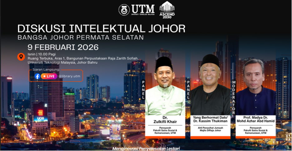 Pada 9 Februari 2026 (Isnin) Jabatan Perpustakaan Universiti Teknologi Malaysia (UTM) telah menganjurkan Program Diskusi Intelektual Johor – “Bangsa Johor Permata Selatan”, yang telah berlangsung pada jam 10.00 pagi hingga 12.00 tengah hari, bertempat di Ruang Terbuka, Aras 1, Bangunan Perpustakaan Raja Zarith Sofiah, UTM Johor Bahru. Program ini merupakan inisiatif wacana ilmiah untuk memperkukuh kefahaman terhadap identiti, jati diri dan hala tuju sosio‑budaya negeri Johor. Ia menghimpunkan intelektual, mahasiswa, pemimpin masyarakat dan pihak berkepentingan bagi membincangkan konsep Bangsa Johor dari perspektif sejarah, institusi dan pembangunan masyarakat kontemporari.