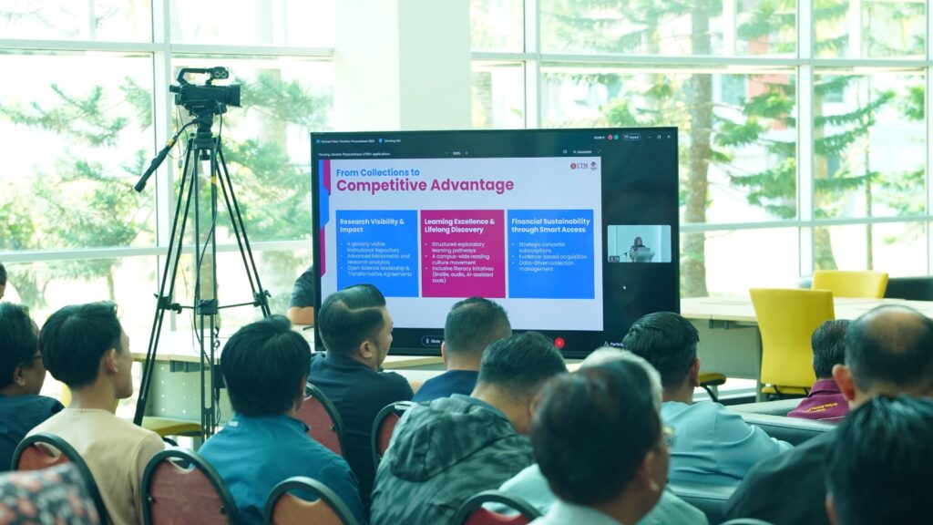 Ketua Pustakawan turut membentangkan Pelan Tindakan 2026 yang merangkumi 9 projek utama yang bakal menyokong Pelan Strategik UTM – ASCEND 2026-2030. Beliau juga memperkenalkan konsep “Perpustakaan sebagai Enjin Pelaburan Ilmu”, iaitu peralihan fungsi perpustakaan daripada pusat kos kepada entiti yang menjana nilai melalui inisiatif filantropi seperti endowmen dan wakaf.